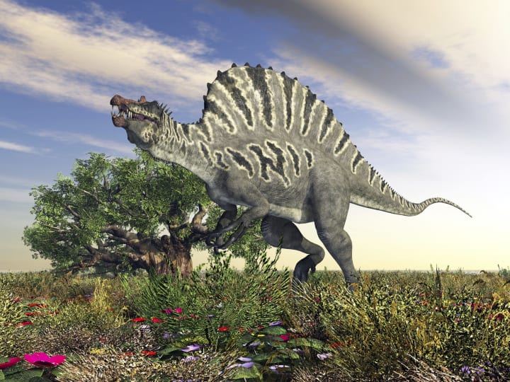 The Spinosaurus, which is a lizard with a spine, an extinct genus of theropod dinosaurs In what, about 112 97 million years ago currently North Africa It is thought to be among the biggest the first carnivorous dinosaurs ever to exist have a maximum length of 60 feet, and a weight of the spinosaurus can weigh up to 23 tons. recognizable for its elongated shape back structure that resembles a sail It probably served as a thermoregulatory. It has a long, crocodile-like Jaws as well. that were covered in pointed teeth this permitted the animal to catch and consume hefty prey like fish, crocodiles, etc various dinosaurs the earliest Spinosaurus fossils were uncovered in 1912 in Egypt.