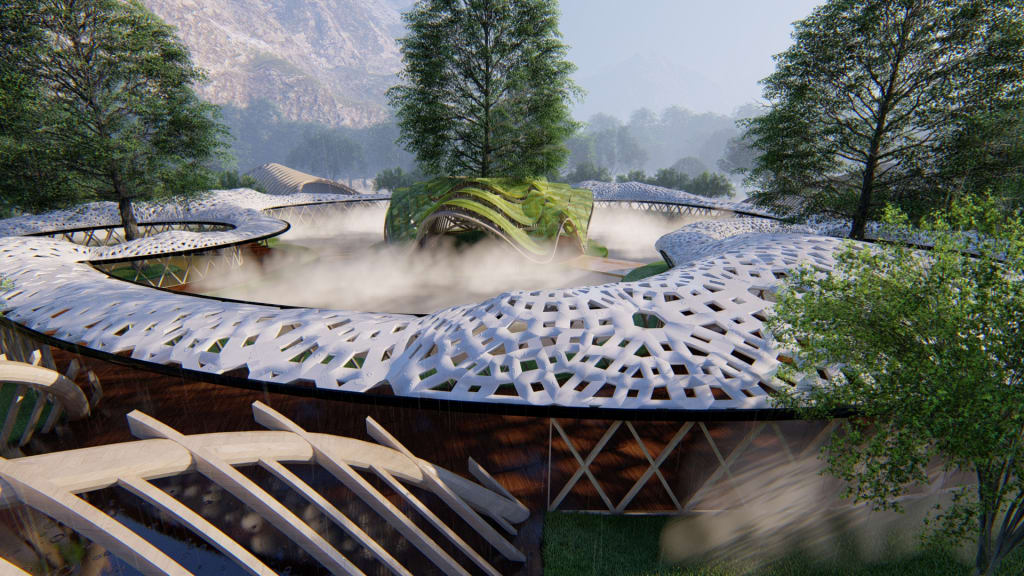 Natural Geometries: The design of facades or structural components can include the use of repetitive, varied patterns that are seen in nature (fractals). These geometries can also have hierarchically organized scales and winding flow rather than be straight with harsh angles.