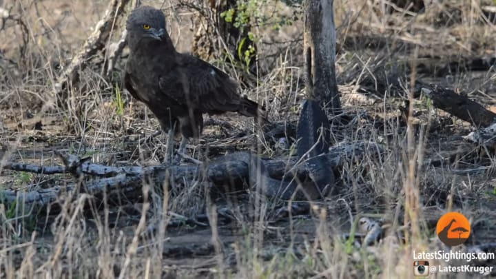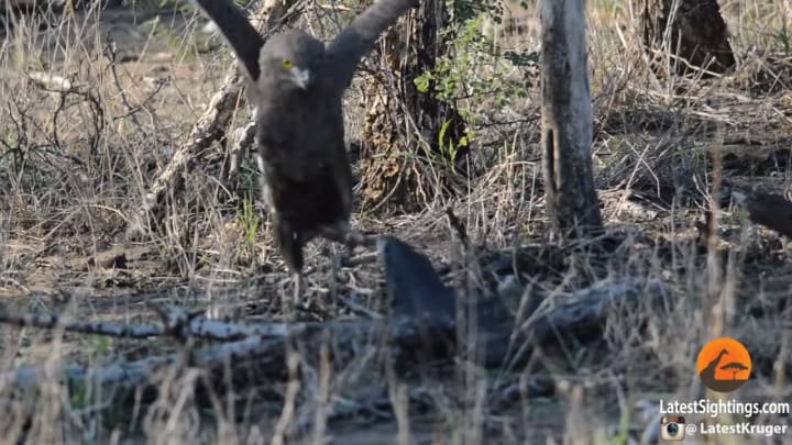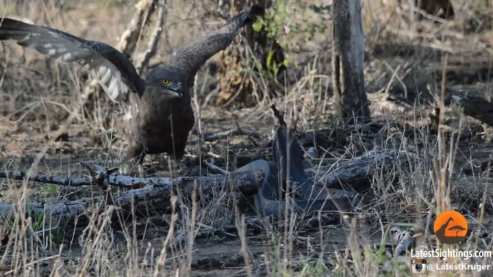 Sensing the risk of a bite, the eagle sprang back instinctively. Snake eagles are not immune to venom; they instead rely on their heavily-scaled legs to avoid bites.