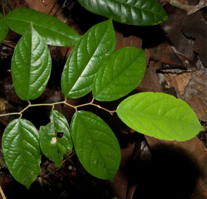 This comes from a tree which is pretty special because everything on it smells like onions or garlic! Its bark is a pale color, and when you look inside, it's kind of whitish. When the leaves are brand new, they are super bright green on top. But underneath, they look kind of dull and can be either pale brown or kind of a flat white because they have lots of tiny white scales on them.