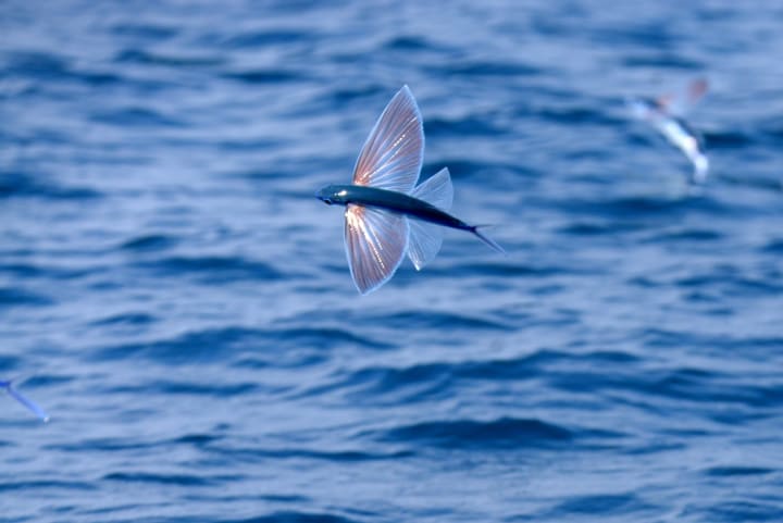 Flying fish can’t fly similarly to birds; they can glide using their long wing-like fins. Once it makes a powerful leap out of the surface of the water, it glides through the air—and can stay airborne at distances of 655 ft long and 4 ft high.The typical diet of flying fish consists of small crustaceans and plankton.