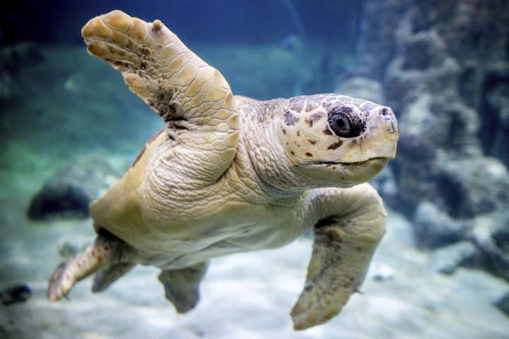 Loggerhead turtles are the most common types of sea turtles in the Mediterranean. They have large heads and powerful jaws with thick, smooth shells. These turtles can be seen in coastal or marine waters and adopt a solitary lifestyle, migrating frequently. Loggerhead turtles are carnivores and feed on clams, crabs, shellfish, jellyfish, and fish.