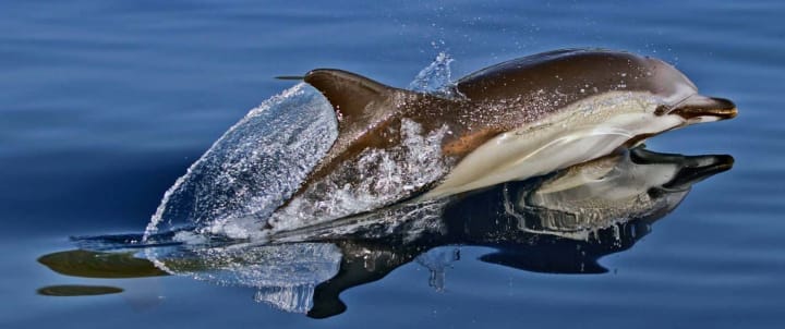 Striped dolphins are distinguishable by the striped patterns on their bodies. They are blue-gray with white stripes. These dolphins travel in groups and are found in open and deep waters. They have amazing speed and can jump three times their body length and enjoy playing in the waters. They dine on squid and small fish, particularly lanternfish. Striped dolphins can be seen in the western and eastern Mediterranean and are most commonly found in the Alboran Sea, Ligurian Sea and the waters of the Balearic Islands, the Gulf of Lion, and the waters of the Iberian Peninsula.