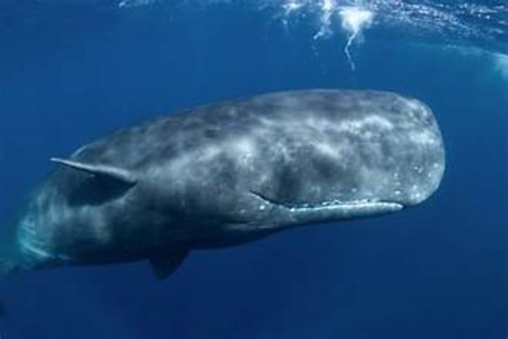 Sperm whales are the biggest whales in the ocean. They have huge square heads, spatulate flippers, dorsal fins, and two pectoral fins. They live in groups and start a solitary lifestyle when they become adults. Sperm whales hunt in deep depths and can stay underwater for over an hour. They dine on squid, octopus, cephalopods, fish, crustaceans, and even sharks.