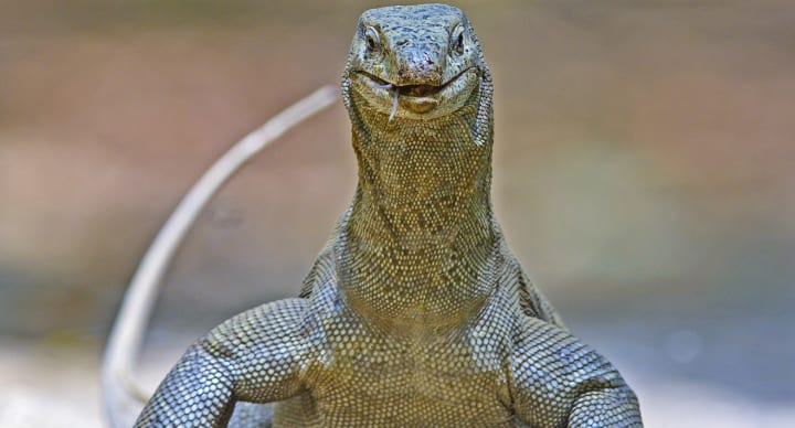 Komodo Dragons are monitor lizards of the family Varanidae. They make their homes on Komodo Island and some neighboring islands of the Lesser Sunda Islands of Indonesia. They've become an ecotourist attraction helping with their protection because they're an endangered species. Their diet consists mostly of carrion but they are also known to attack pigs, deer, and cattle.
