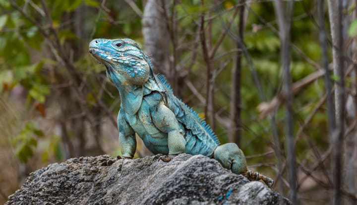 Blue Iguanas are an endangered species of lizards endemic to the island of Grand Cayman. They prefer to make their home in rocky, sunlit, open areas in dry forests or near the shore. These lizards are herbivores and their diet consists of plants, fruit, and flowers.