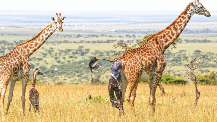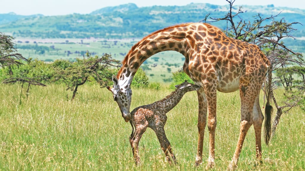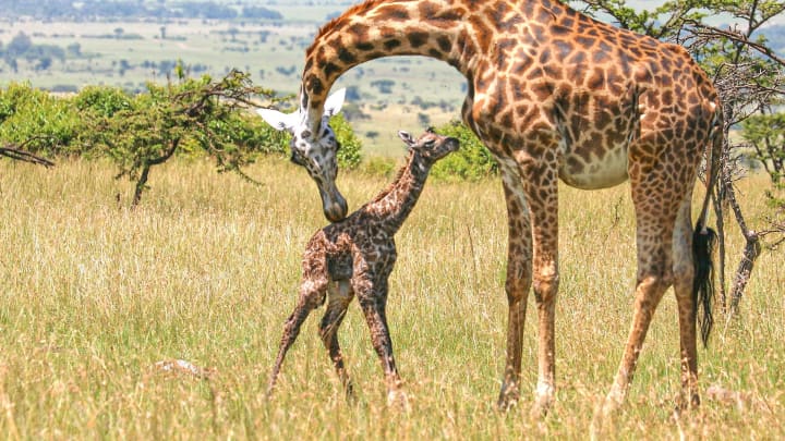 Like many other herbivore prey species, young giraffes are frequently targeted by predators. As such, its mother will quickly lick away the amniotic fluid that covers its body so they are not attracted by the distinctive scent.