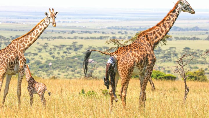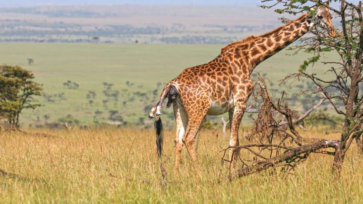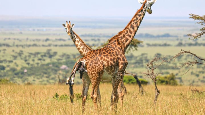As we all know, giraffes are really tall, with females reaching heights of up to 4.8 metres. Since the female gives birth, that means the calf's entry into the world entails a 2 metre drop.