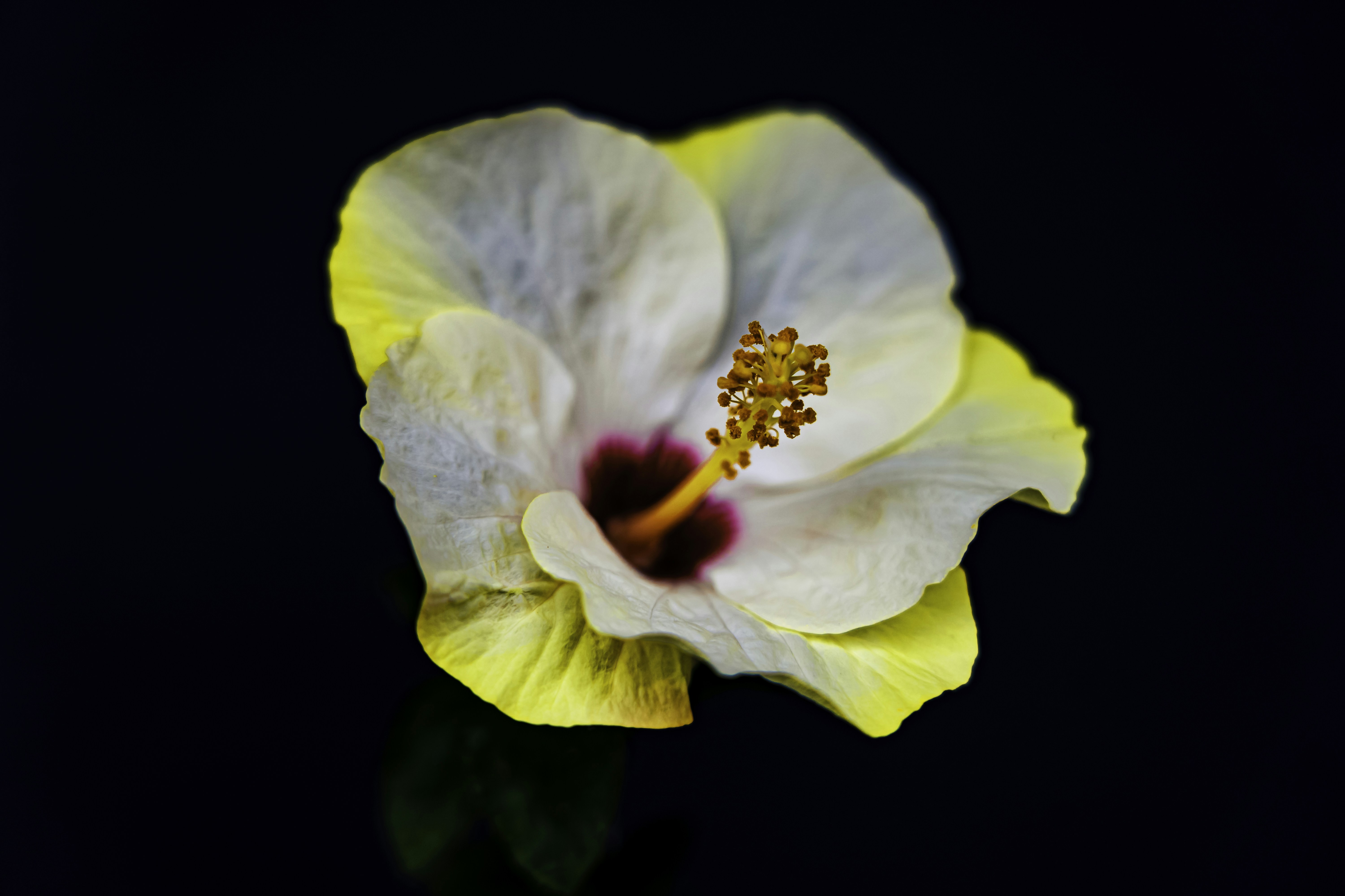 - Pale yellow to creamy white petals with a deep pink to purplish center.