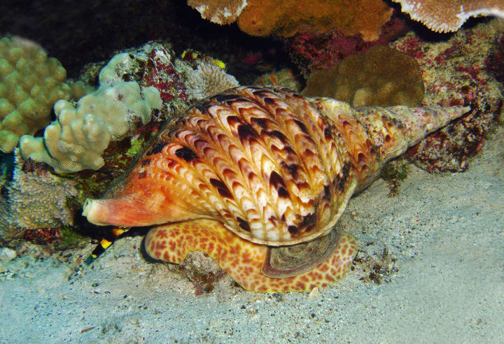 Their spiral-shaped shells consist of calcium carbonate, features a beautifully patterned surface with brown and cream tones. The shell provides protection against predators and is often sought after by collectors, which has led to localized population decline.
