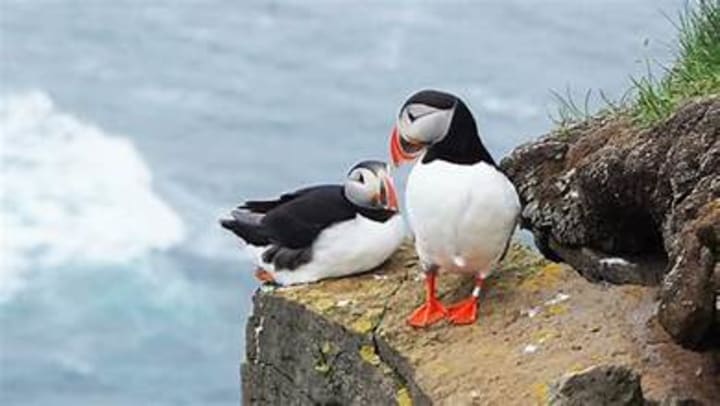 Tufted puffins are seabirds with a unique appearance and vibrant orange beaks. Along the Pacific coast they nest on cliffs. Puffins are quick fliers, good swimmers, and dive to catch fish.