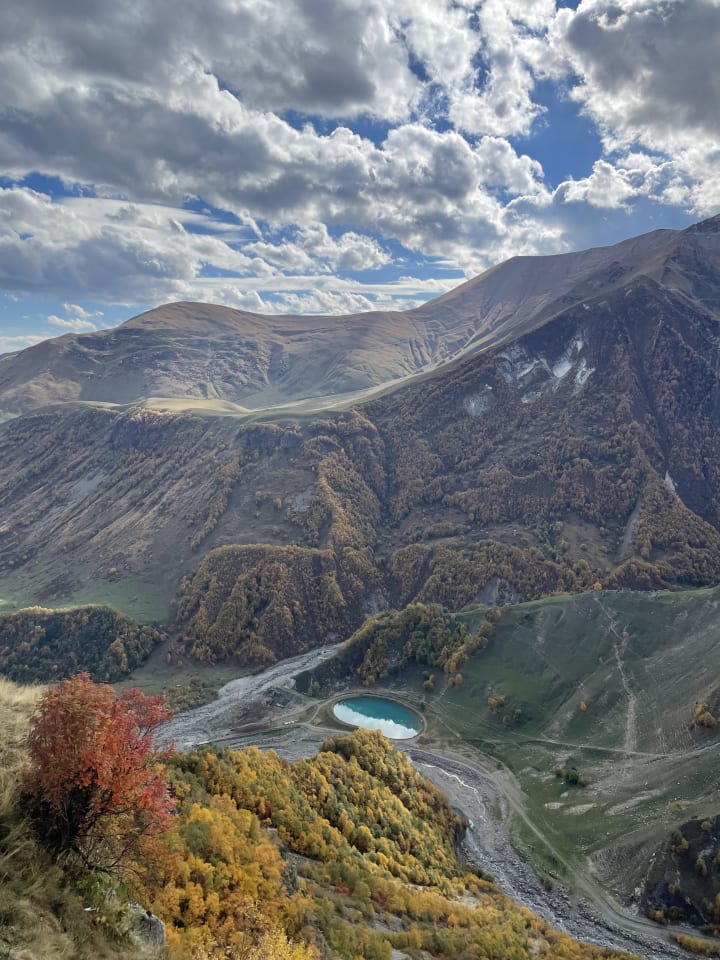 This was an incredibly dramatic and impressive trip for me because I saw Mount Kazbegi - one of the tallest mountains in the north of Georgia, of 5,054 meters. I took pictures of it from the iconic Gergeti Trinity Church located on a nearby hill below it.