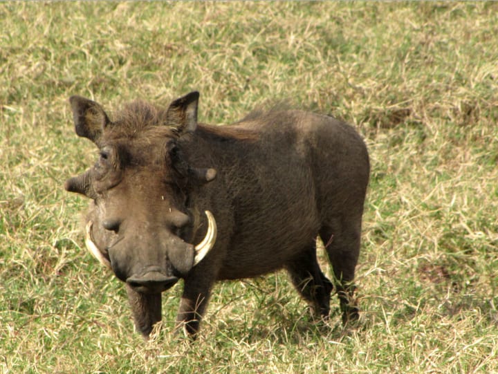 A rather ugly animal is known as the warthog. These are pigs with large, flat heads, and toughened snouts. They seem to be covered all over with warts but instead, these are fleshy pads to protect the pig if in combat. The warthog males collide head-to-head to get the other off balance. Their very sharp pointy tusks can do a lot of damage.