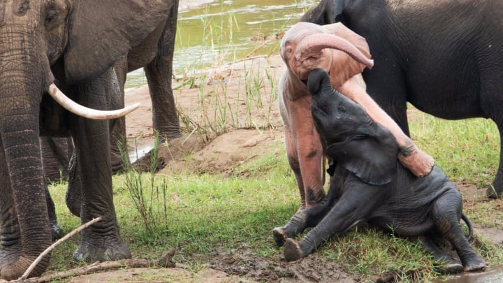 Rare Pink Elephants Play In The Riverbed