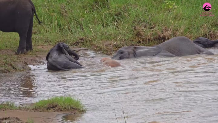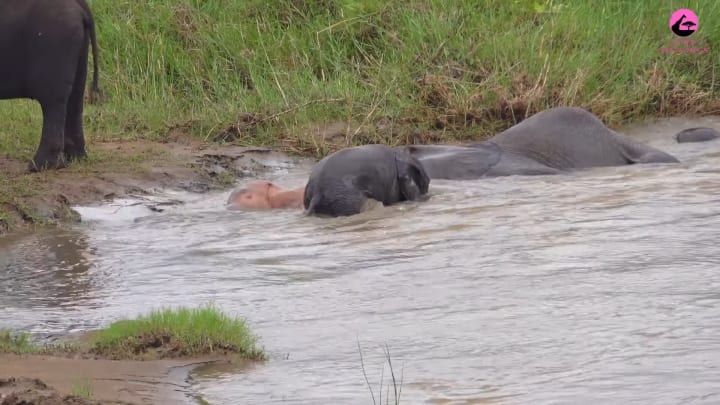 Alongside one of the bathing calves, there is a pink shape. As the calves interact with it, it is apparent that it is some kind of animal. But what could it be?