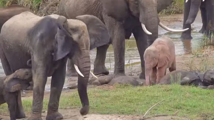 Albinism in elephants can present affected calves with various challenges. While this calf appears fully accepted by its herd, there have been instances where others were rejected.