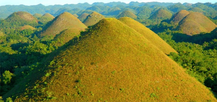 The Chocolate Hills are located on Bohol Island in the Philippines. There are more than 1,000 odd mounds. The hills are chocolate brown. During the dry season the grass dries up and gives them their color. They are believed to have been formed by coral deposits that were brought to the Earth's surface some millennia ago.