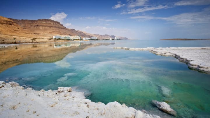 The Dead Sea or the Salt Sea is a historic body of water between the Asian countries of Israel and Jordan. Its unique elevation below sea level makes it the lowest point in the world. It is full of massive amounts of sediments like shale, clay, sandstone, rock salt, and gypsum. It is one of the saltiest bodies of water on Earth. The sea has been slowly shrinking over the decades as its water has been siphoned by Israel for human use. Since there is little rainfall in that part of the world, the sea has been steadily decreasing in size by about three feet every year.