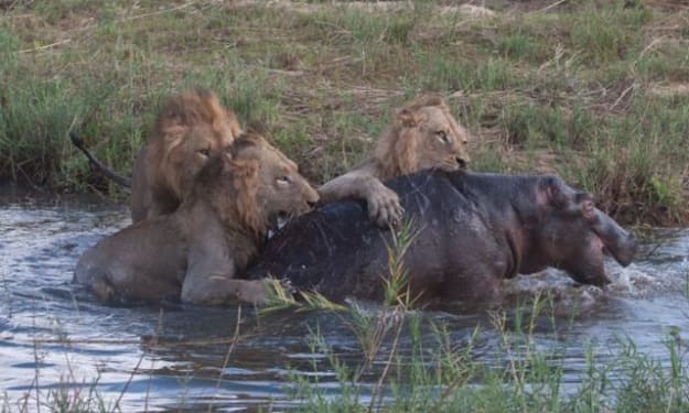 In 2012, the three male lions met each other occasionally while they were wandering on African soil, so they formed an alliance to hunt together. They found a hippopotamus. Due to their superiority in numbers, the Lions Alliance dispatched only 2 members at first, and it was a meal of gnawing and grabbing!