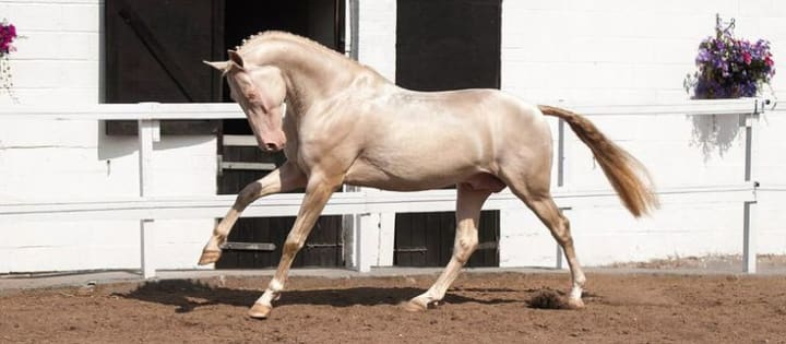 These horses come from an ancient horse breed and are known for their unique metallic shine. There appears to be about 6,000 Akhal-tekes left in the world. The Akhal Teke Association of America explains that the opaque core of the hair shaft is replaced by the transparent medulla, which bends the light to create a metallic glow. These horses are used for long-distance riding and for most English disciplines. The famous perlino Akhal-Teke stallion Kambarbay has been declared numerously as the most beautiful horse in the world.