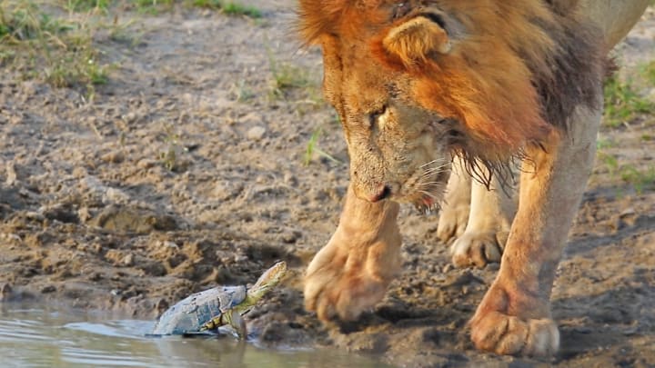 The shadowy shape surfaced to reveal a bony shell. It was the terrapin! This little guy was fearless in its resolve, and if it had managed to scare a male lion away, why not a lioness?