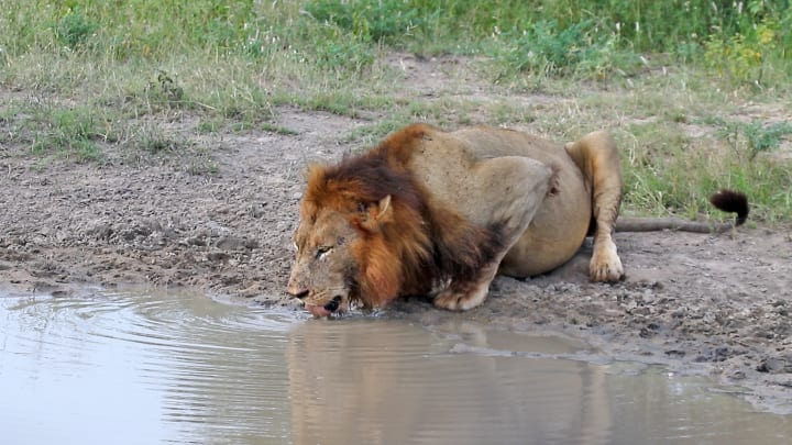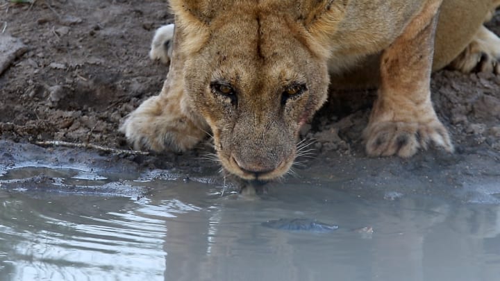 However, the lion remained determined not to let anything disturb his peaceful drinking time.