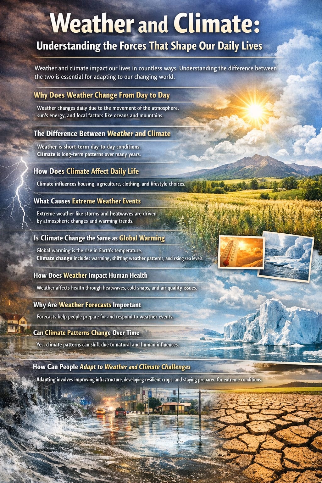 Weather and climate are powerful forces that influence nearly every aspect of life on Earth. By understanding how they work and how they affect the world people can make better decisions protect themselves and adapt to a changing environment. As weather patterns become more complex and climate challenges grow awareness and preparedness remain key to a safer and more resilient future.