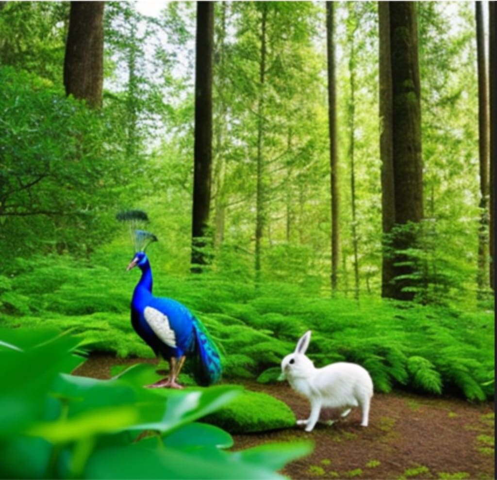 Once upon a time, in a lush green forest, there lived a hare and a peacock. The hare was known for its speed and agility, while the peacock was renowned for its beauty and grace.