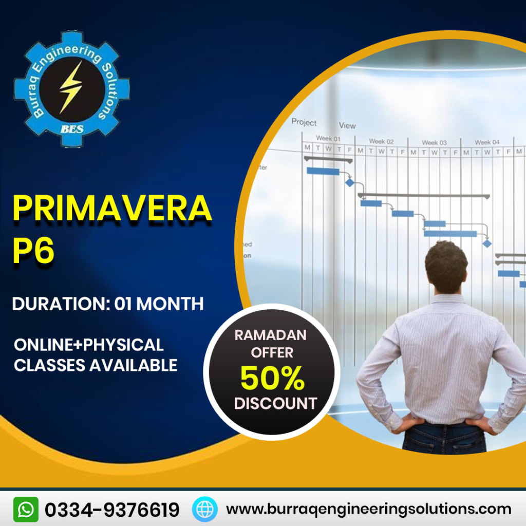 If you want to learn Primavera P6 Training Courses, Burraq Engieering Solutions is an Engineering institute that provides best Online and Physical Primavera P6 Training Courses in Lahore Pakistan. You can learn more Engineering Courses from Burraq Engineering Solutions Online and Physical classes are available.