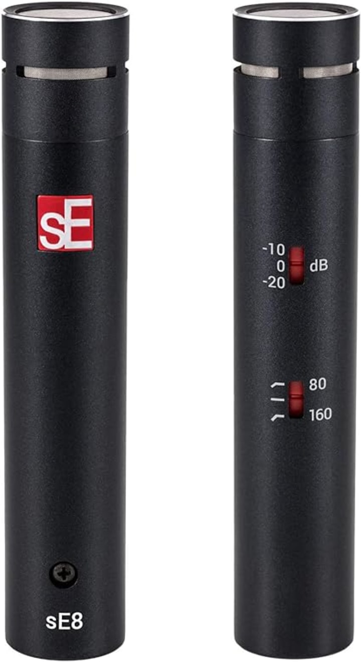 The sE8 has a full 20Hz-20kHz frequency response, can withstand high SPL, and comes with a variety of accessories, including a case and clip. It does not come with a shock mount, but it is lightweight and simple to use. Just remember to use phantom power.