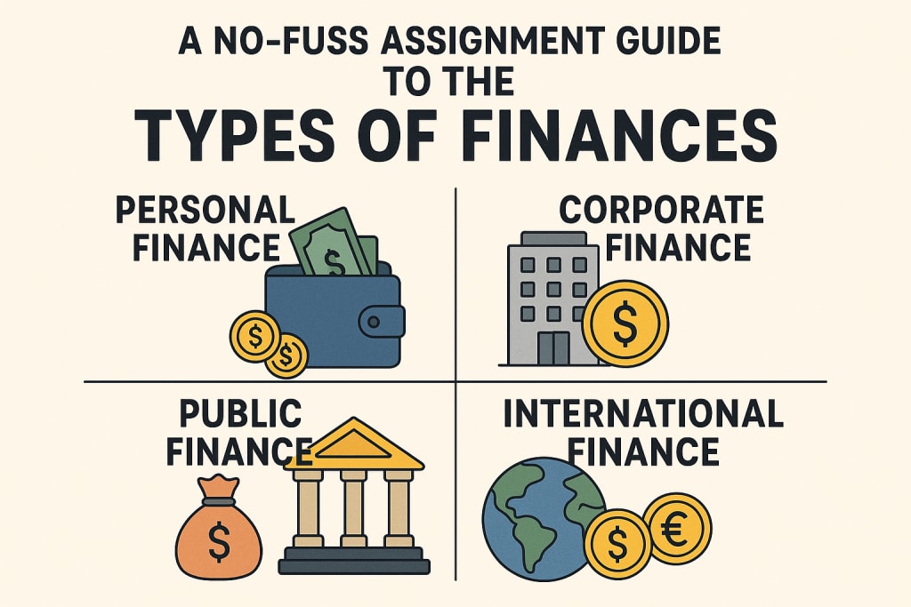 Finance comes in different types depending on who is using the money and for what purpose. So, each type has its role, and that is what you are going to learn in the sections below. Let’s look at the main ones in simple words. Because the more you understand how money moves, the easier it gets to write and explain things related to that matter. Moreover, you learn to solve finance-related questions.