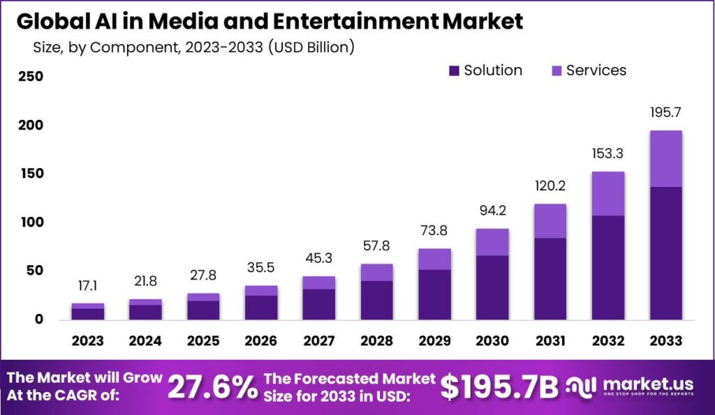 The Global AI In Media And Entertainment Market size is expected to be worth around USD 195.7 Billion by 2033, from USD 17.1 Billion in 2023, growing at a CAGR of 27.6% during the forecast period from 2024 to 2033.