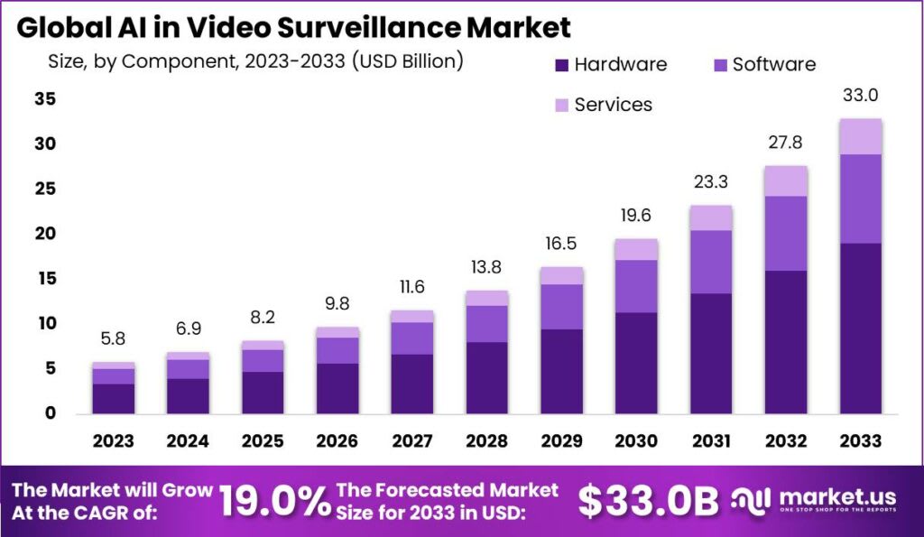 The Global AI in Video Surveillance Market size is expected to be worth around USD 33.0 Billion by 2033, from USD 5.8 Billion in 2023, growing at a CAGR of 19% during the forecast period from 2024 to 2033.