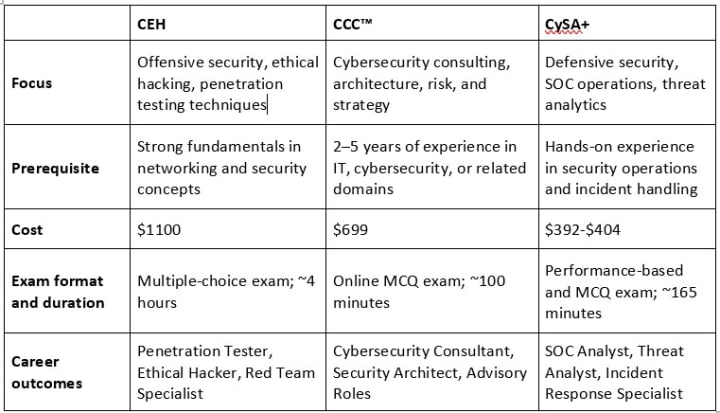CCC™ is better suited for consulting transitions, as it emphasizes architecture, risk assessment, and advisory skills beyond purely technical or operational security tasks.