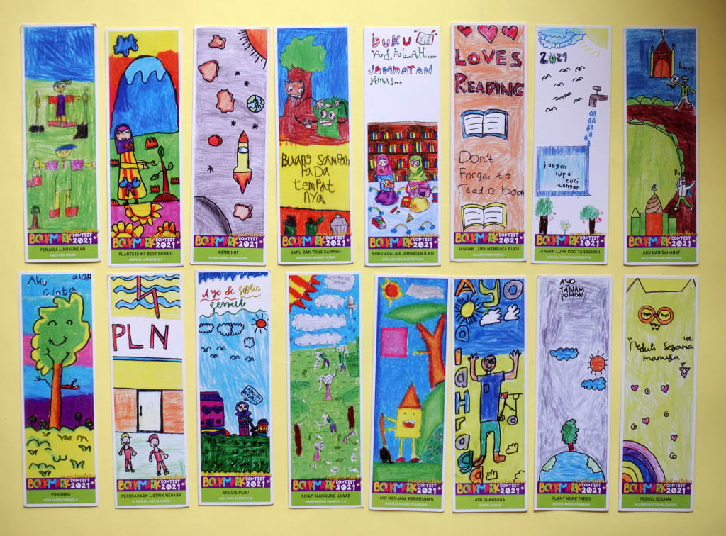 The students' designs are then collected by the librarian, Dwi Rinda Aulia, who compiles them and prints them into bookmarks. The bookmarks are then placed in the library for everyone to see and use.