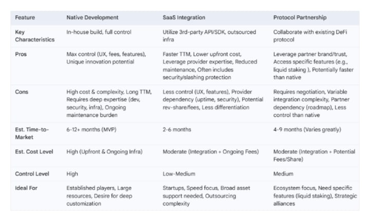 There are several distinct DeFi staking app development and integration pathways, each with its own set of advantages, disadvantages, and implications for cost, time-to-market, and control. The choice between building natively, integrating a third-party service, or partnering with existing protocols is a critical decision that should align with the provider’s overall business strategy and resources.