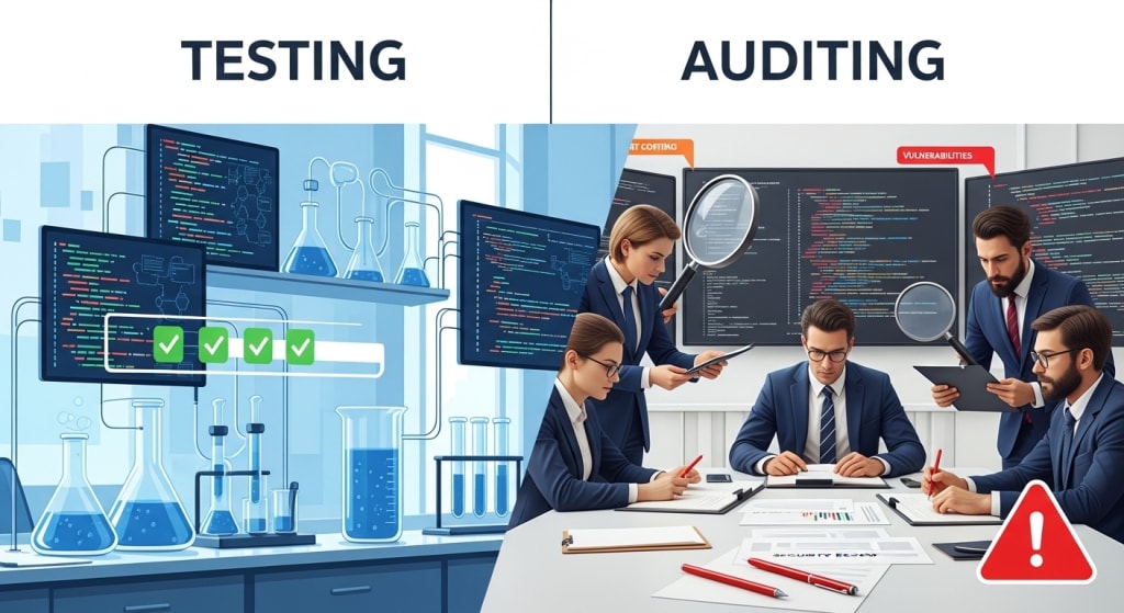 The difference between testing and auditing smart contracts lies in intent, methodology, and outcome.