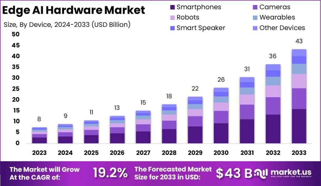 The Global Edge AI Hardware Market size is expected to be worth around USD 43 Billion By 2033, from USD 8 Billion in 2023, growing at a CAGR of 19.2% during the forecast period from 2024 to 2033.