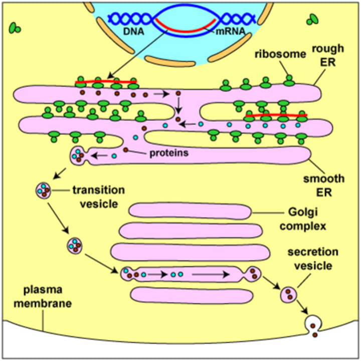 As was already established, the smooth ER places proteins made in the rough ER into transition vesicles. As the transition vesicles fuse with the Golgi complex membrane, the proteins and glycoproteins inside are then transferred to the Golgi complex.