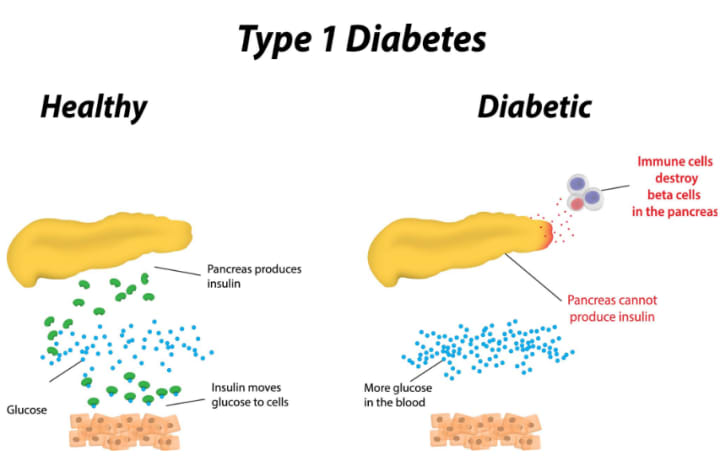 I like to remember the “I” in type I diabetes for “self.” Type I diabetes arises mainly due to an autoimmune attack - an individual’s immune system mistakenly considers specific organs or cells to be outsiders; the immune system then works to destroy these specific parts (Cleveland Clinic, 2024). Here, the targeted cells are the “beta cells” - the insulin-producing cells - of the pancreas. With destroyed insulin-producing cells, very little insulin will be made; if the amount of insulin is low, even if we have a buildup of glucose in the blood after we eat a meal, we will not be able to decrease the blood glucose level (American Diabetes Association, 2024). Although genetic and environmental factors are commonly attributed to this autoimmune attack and type I diabetes, the exact cause is not exactly known (Mayo Clinic, 2024).