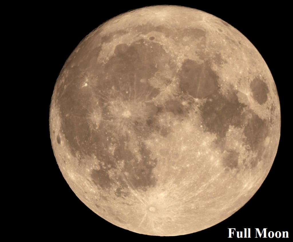 1. A full moon occurs when the Moon is on the opposite side of the Earth from the Sun, causing the entire illuminated side of the Moon to face the Earth.