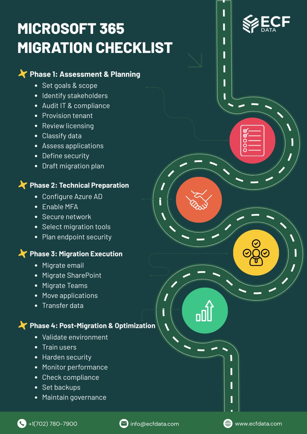 • Consider different migration methods (e.g., cutover, staged, hybrid) based on your organization’s size and complexity.