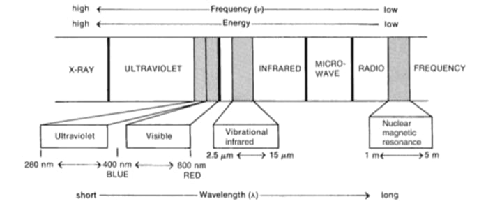 The term spectroscopy is defined as interaction of the electromagnetic radiations with the matter. All types of compounds organic and inorganic, containing covalent bonds must absorb frequencies in the range of Infrared of the electromagnetic radiations. This region has wavelength higher than the ultraviolet region and has shorter wavelength than the microwaves region. It ranges from 400cm-1 to 4000cm-1. For convenience we are interested in the vibrational area of the infrared region. These radiations are invisible to human eye. IR would be sectioned into three major types: