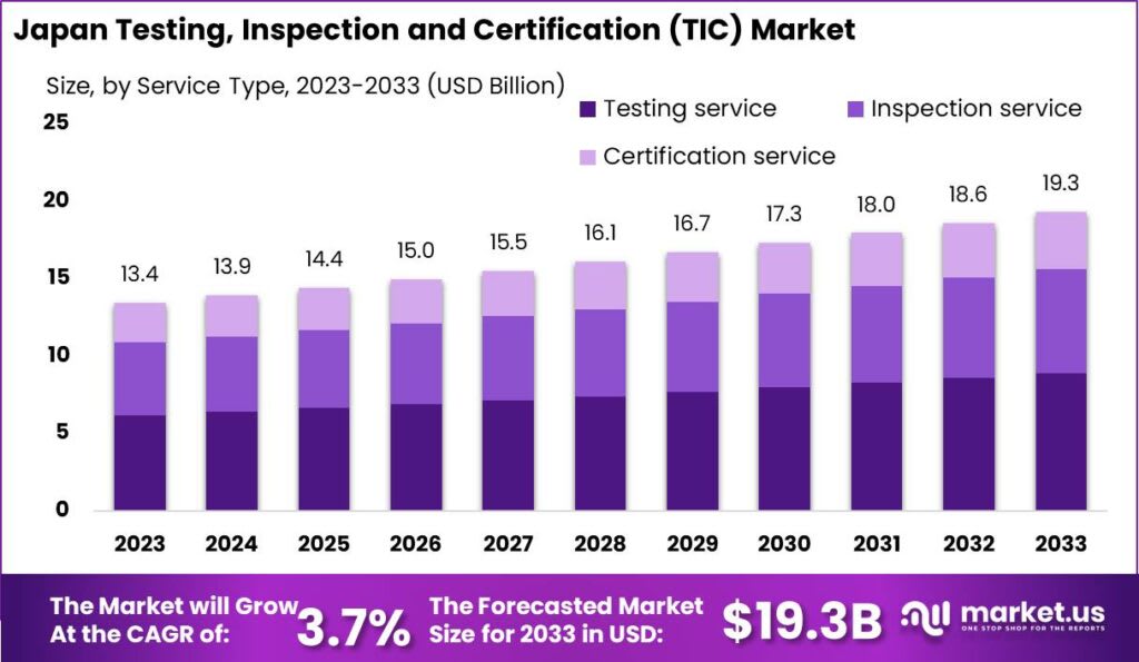 The Japan Testing, Inspection and Certification (TIC) Market size is expected to be worth around USD 19.3 Billion by 2033, from USD 13.4 Billion in 2023, growing at a CAGR of 3.7% during the forecast period from 2024 to 2033.