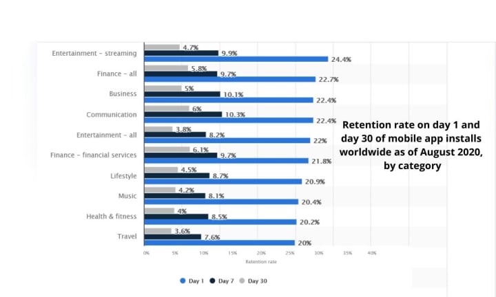 The retention rate for most apps hovers around 42% for 30 days, as per Geckoboard. It means more than half of the people who download your app will be gone in just 30 days. If you're serious about making money off an app or have plans to use it as a long-term service, you want that number much higher.