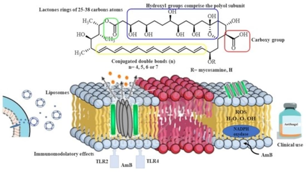 The macrocyclic rings of the poleyenes have one side that is highly lipophilic and has plenty of conjugated double bonds, and the other side that is hydrophilic and has lots of OH groups. Some have a polar aminosugar and a carboxylic acid group at one end. They are all soluble in water and unstable in watery media.