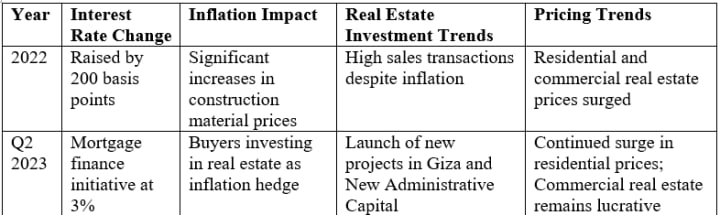 Another crucial element in real estate marketing strategies was inflation. In 2017, the Egyptian property market saw high inflation, around 30% yearly (Marzouk and Aboushady., 2018). During this particular time property prices shot up causing a short term slowdown in the marketplace. However developers responded by making much more flexible payment plans and concentrating investments in areas less impacted with inflation - an adaptive marketing strategy. In 2022, the escalating inflation and currency devalued impacted the Egyptian real estate industry, which resulted in sharp rises in building material costs. Regardless of these issues, sales transactions stayed strong as the customers attempted to hedge inflation and currency devaluations with real estate investments.