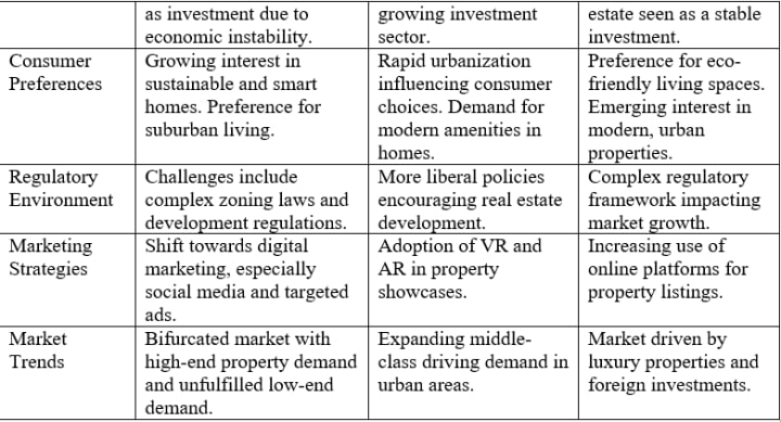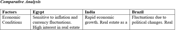 Table above demonstrates similarities and differences among Egypt, Brazil and India real estate markets. There are common patterns like the impact of economic conditions on real property investment but each market is also unique. For instance, Egypt has a growing interest in sustainability and also faces issues of complicated zoning laws whereas India has an urbanising trend and a push for modern amenities. Brazil's marketplace, however, is more concerned with environmentally friendly living areas but also has its very own regulatory hurdles. These insights create a broad overview of factors affecting real estate markets in these rising economies..