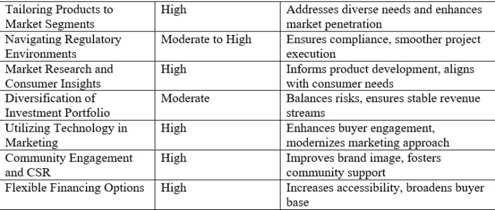 Developers must integrate sustainable and smart home technology in their projects in line with the increasing customer interest on environmental sustainability and technological breakthrough. This approach meets evolving consumer demands and positions developers as forward thinking and responsible. As a reaction to the trend towards suburban living developers are urged to concentrate on suburban development projects focusing on community, proximity to nature and big living areas. Additionally, advanced online marketing strategies including social media campaigns and virtual reality tours help in getting a broader audience. Developers also need to be flexible to industry changes / customer tastes - this requires ongoing market analysis or readiness to modify product offerings.