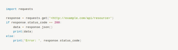 Here's a simple Python example of using the requests library to make a GET request: